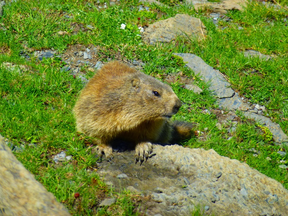 Desde el collado se tiene unas vistas magnificas al Gran Bachimala, para bajar se toma un sendero por terreno herbácea con pocas pedreras del margen izquierda del barranco Chisten, en ese momento atravieso una zona repleta de marmotas, tengo la fortuna de disfrutar de unos momentos de gran armonía tirado en la hierba.