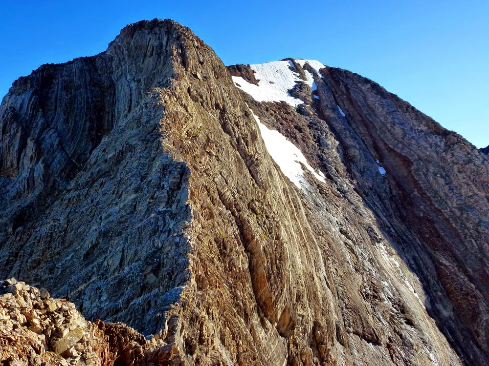 Poco después y comenzando la subida de nuevo desde el collado, la cresta se convierte de nuevo en su propia definición, afilada, escalonada y vertical. Se superan varios pináculos sin nombre, el avance se hace entretenido, hay que ir despierto y se puede disfrutar de un entorno privilegiado, no puedo dejar de observar y admirar mi alrededor. De lo más espectacular es la imagen de la mole del Posets, rey y mayor