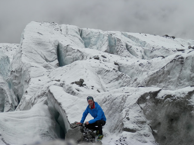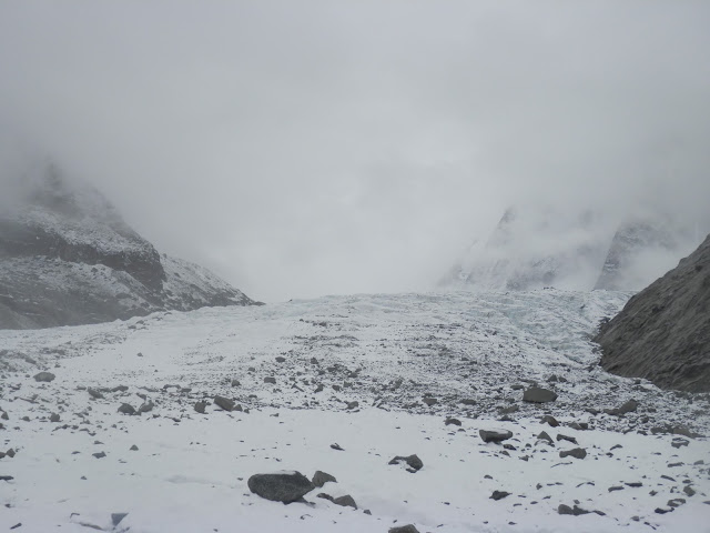 No es suficiente con quedarse en el mirador, hay que avanzar para pasar de la roca al hielo. Desde que pisamos el hielo, nos separan unos 5 kilómetros del Refugio de Argentière, era mi objetivo llegar hasta el, pero el día se cerró y empezó a nevar, el tiempo por la tarde empeoraría, así que tras 1 kilómetro más o menos decidí darme la vuelta. Estas formaciones de hielo están vivas, y en constante movimiento, es normal estar