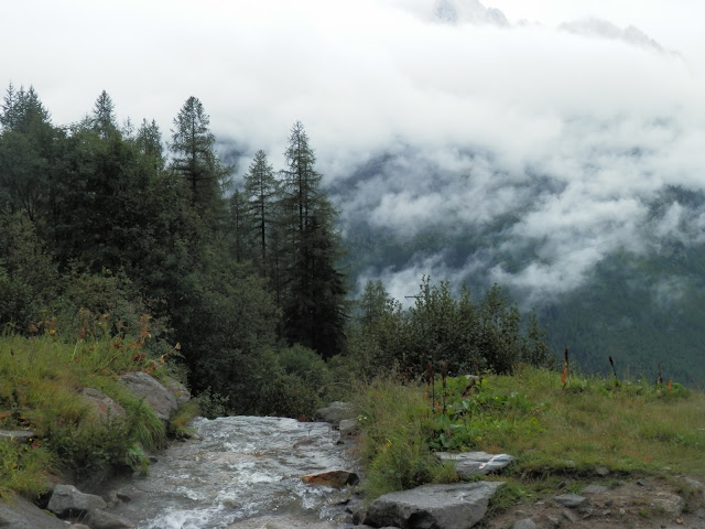 por las formas caprichosas y quebradas que tiene el glaciar. Estamos presenciando una masa de hielo de millones de años, enmarcado en un circo entre grandes montañas. Aunque la climatología no me acompañó, durante el camino y desde el mirador se puede observar los picos de l'Aiguille du Chardonet como primer pico gigantesco a nuestra izquierda, l'Aiguille d'Argentiere en segundo plano también a la izquierda, a la
