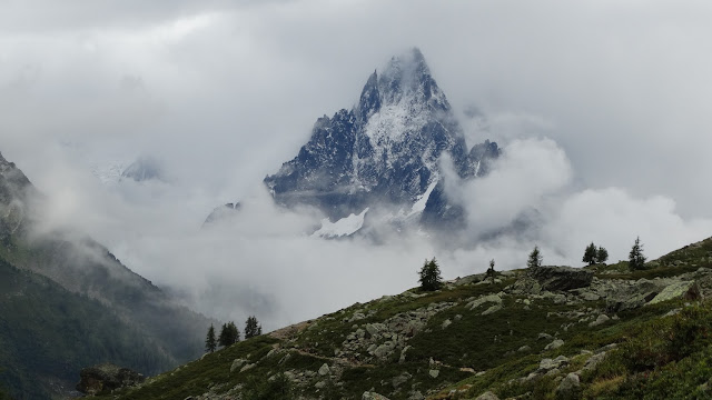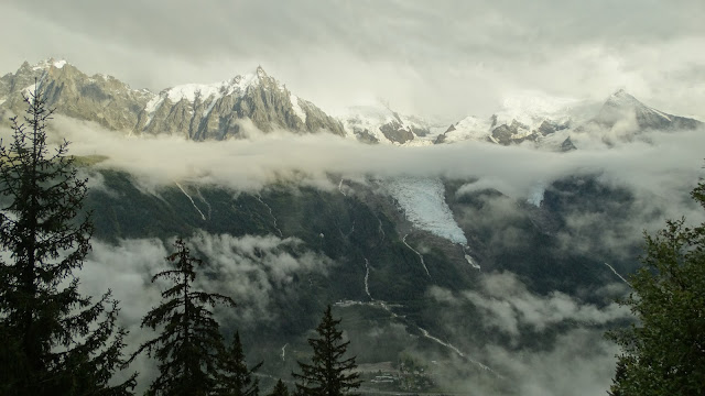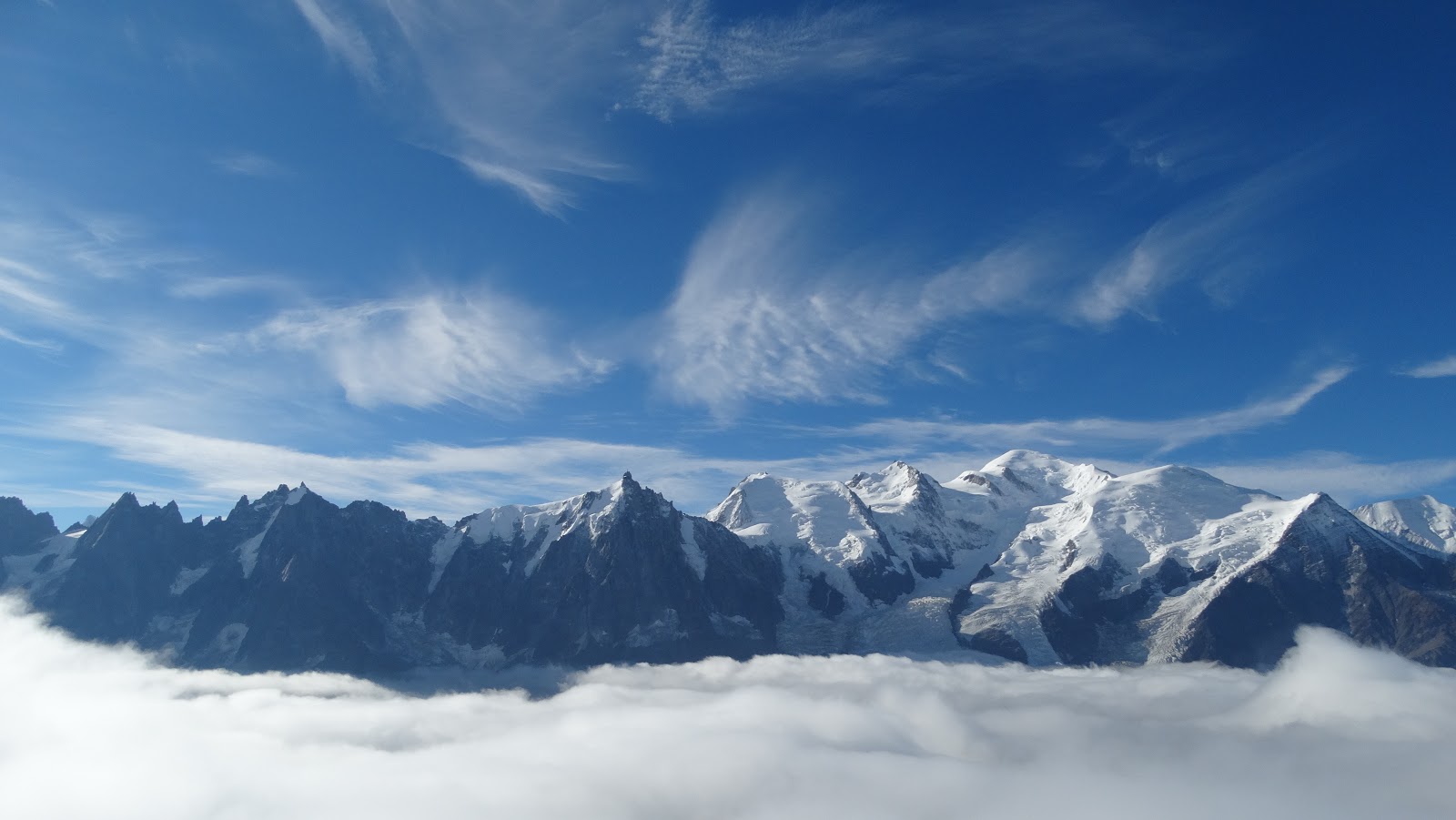 Te guste o no el alpinismo, merece la pena subir hasta los 2.520 metros que tiene el Monte Le Brévent para contemplar las vistas. Tuve la suerte de amanecer prácticamente allí arriba, tras dormir en el lago Brevént, el cielo duró despejado lo justo para producirse un flechazo. En primer lugar por la visión de los gigantes blancos: un colosal paredón que cierra completamente el valle de Chamonix por el sur. De izquierda a derecha, la Aiguille du Midi (3.842m) (donde se distingue claramente la estación superior de su teleférico, la de mayor altitud del mundo), el Mont Blanc du Tacul (4.248m) (recién vencido por Meteocoll y Wind), el Mont Maudit (4.465m), el Mont Blanc (4.809m), el Dome du Gouter (4304m), la Aiguille du Gouter (3.863m) y la Aiguille de Bionnassay (4.051m). Más a la izquierda están las Grandes Jorasses o el Dru, donde se han escrito algunas de las páginas más celebres del alpinismo mundial.
