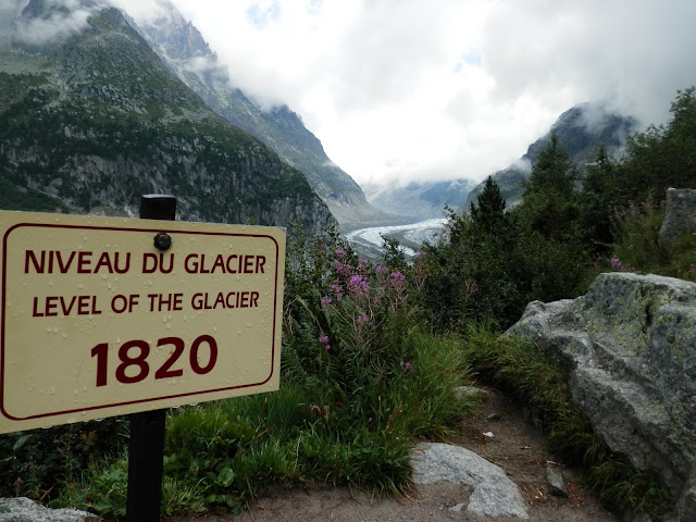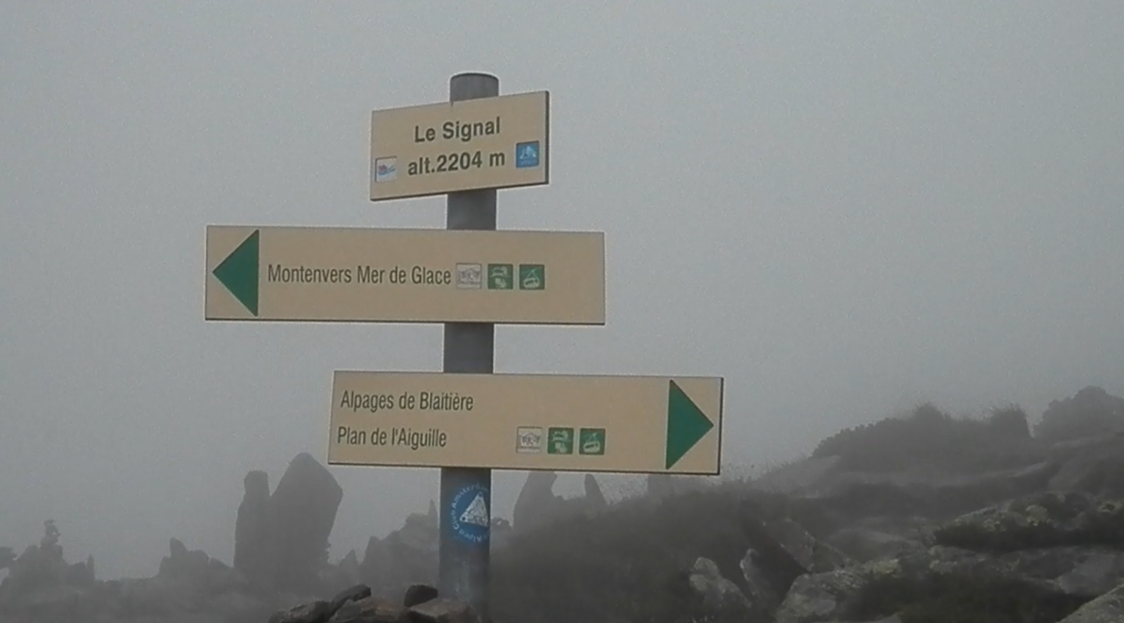 Después de retroceder el camino andado por el glaciar y subir por las escaleras verticales que une el sendero con el glaciar, se sigue ascendiendo en dirección a la estación Montenvers, un autentico complejo turístico con todo lo necesario para dicha actividad. Atravesamos la multitud de personas que se congregan en lo alrededores, y conectamos con un sendero a la izquierda del Hotel Montenvers, secsube haciendo zig-zags, dejando a la izquierda la Mer de Glace, sin dificultades, dando acceso a un lugar bastante bucólico caracterizado por una multitud de mojones, conocido como Signal Forbes (2.200 metros), desde allí se puede apreciar un notable panorama de la Mer de Glace, los Drus, las Grandes Jorasses y las agujas de Chamonix. Aunque una vez más, en este viaje, el tiempo no me permitió hacer uso de uno de los sentidos más importante, la vista, aunque la sensación de encontrarse en aquel lugar erizaba la piel.