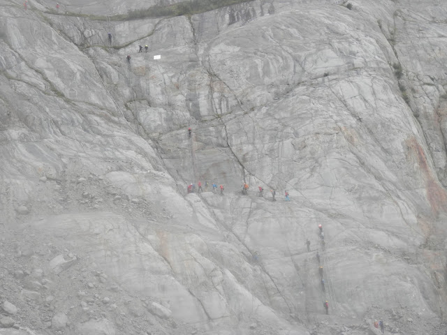 El día no estaba siendo muy bueno para disfrutar de la inmensidad que me rodeaba, aún así es considerable la cantidad de gente que se dejaba caer al glaciar. En la imagen de abajo se puede observar la cola de personas para bajar y subir por los 3 tramos de escalera. En los días con niebla como fue el caso, si nos adentramos en el glaciar, hay que prestar atención al camino de vuelta, para no dejarse atrás el acceso a la pared y a las escaleras.