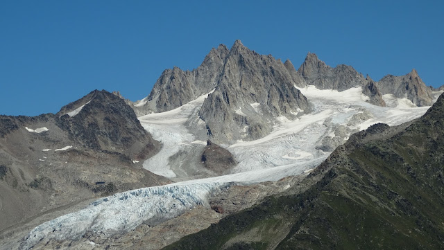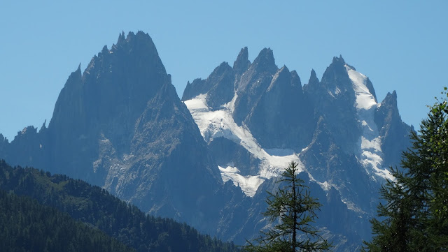 A la izquierda de la foto inferior predomina la Aiguille Verte tiene una altura de 4.122 metros, está considerada uno de los cuatro miles más difíciles de los Alpes, puesto que no tiene ninguna vía con gradación inferior a MD y los itinerarios glaciales son lo suficientemente derechos y sostenidos para merecer también esta calificación. A la derecha la Aiguille Du Dru, esta montaña tiene dos cimas: la Grande Aiguille du Dru (o la Grand Dru) 3.754 metros y la Petite Aiguille du Dru (o la Petit Dru) 3.733 metros. Las dos cimas se encuentra en la arista oeste de la Aiguille Verte y están conectadas entre sí por la Brèche du Dru (3.697 metros). La cara norte de la Petit Dru está considerada como una de las seis grandes caras norte de los Alpes.