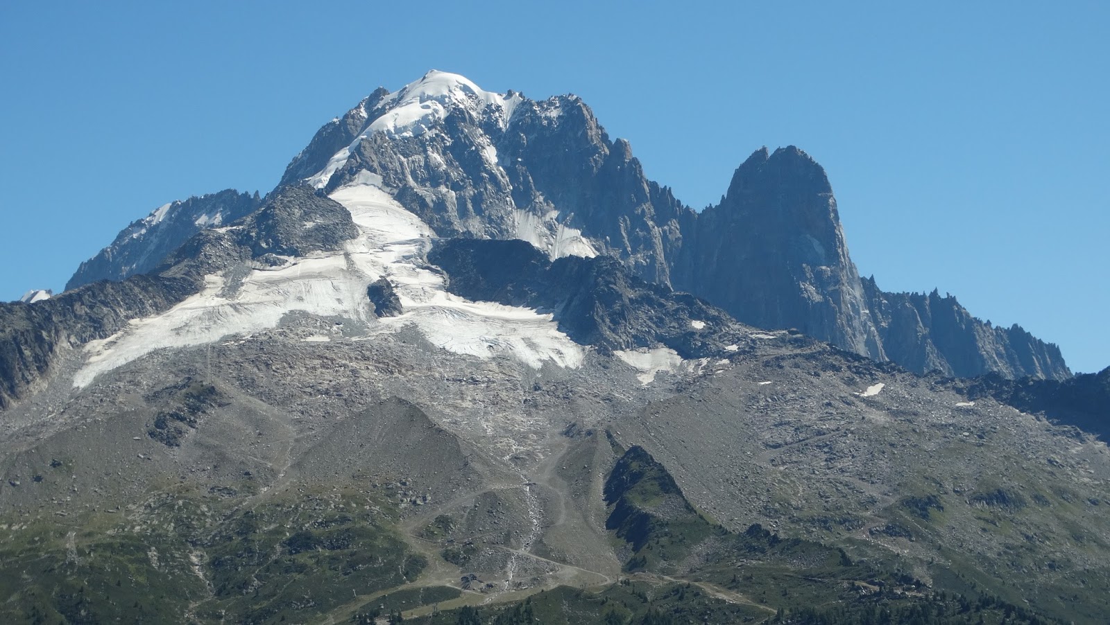 A la izquierda de la foto inferior predomina la Aiguille Verte tiene una altura de 4.122 metros, está considerada uno de los cuatro miles más difíciles de los Alpes, puesto que no tiene ninguna vía con gradación inferior a MD y los itinerarios glaciales son lo suficientemente derechos y sostenidos para merecer también esta calificación. A la derecha la Aiguille Du Dru, esta montaña tiene dos cimas: la Grande Aiguille du Dru (o la Grand Dru) 3.754 metros y la Petite Aiguille du Dru (o la Petit Dru) 3.733 metros. Las dos cimas se encuentra en la arista oeste de la Aiguille Verte y están conectadas entre sí por la Brèche du Dru (3.697 metros). La cara norte de la Petit Dru está considerada como una de las seis grandes caras norte de los Alpes.