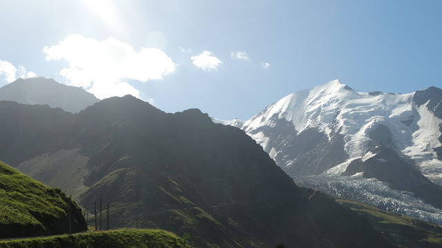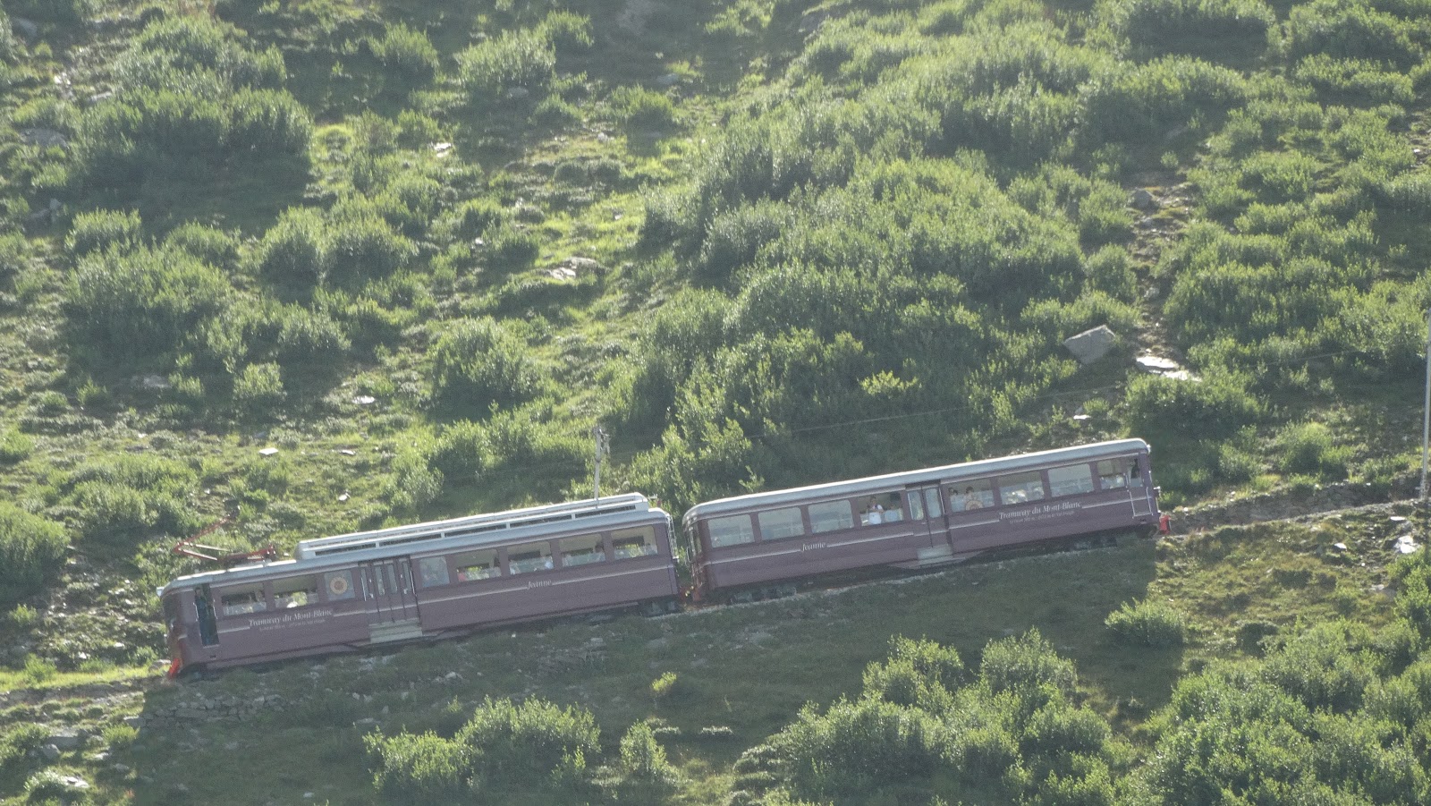 Desde la estación intermedia de Bellevue se puede continuar por las vías del tren caminando, aunque un cartel lo prohíbe, por resultar peligroso. Hay bastante espacio a cada lado de los raíles, pero si no fuera el caso, el tren va tan despacio que puedes desplazarte varios metros hacia la cuneta para más tranquilidad. El camino junto a las vías sigue siendo en completa soledad, con estupendas vistas a la Aiguille de Bionnassay. El tren a esas horas de la mañana sube cargado de personas, así que imagino que arriba debe de estar bastante animado. Empiezo a divisar el Glaciar Bionnassay que desciende desde los 4.000 hasta los 1.800 metros, se encuentra al pie de la ladera norte de la Aiguille de Bionnassay.