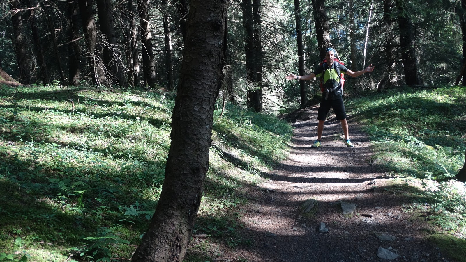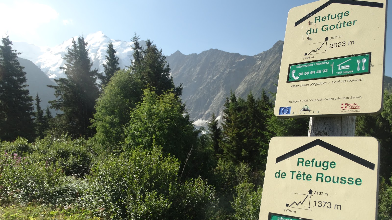 Desde la localidad de Les Houches a una altitud de unos 1.000 metros, junto al teleférico que te sube a la estación de Bellevue (Bella Vista), parte un camino asfaltado, flanqueado de chalets y coquetas viviendas unifamiliares. En la parte alta del barrio otro cartel me encamina hacia la izquierda, el interior del bosque. Hace mucha calor y enseguida me noto empapado, el ritmo es lento por el peso de la mochila. Cara de fatiga, pienso, podría haber subido en uno de los remolques, pero entonces recuerdo la razón por la que vine y la sonrisa de nueva en la cara pervive. La senda asciende por un umbrío bosque de píceas, una conífera de aspecto similar a los abetos. La subida es constante, se cruzan varios arroyos de agua y alguna que otra señal hacia lugares como el Col de Voza, sitio emblemáticos de esta zona. El bosque desemboca en una explanada, desde donde se divisa el edificio del teleférico de Bellevue que se encuentra a una cota de unos 1.800 metros.