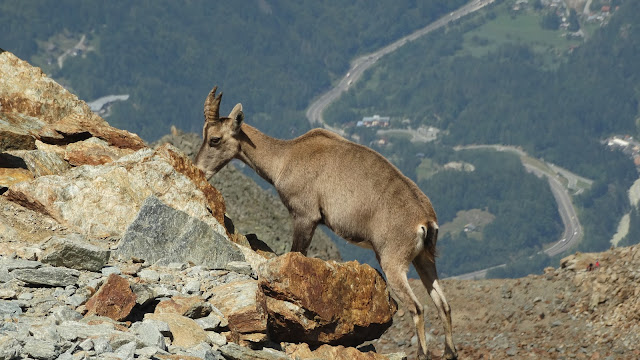 Un camino evidente sube en fuerte zig-zag hasta llegar a una zona de piedras, grandes bloques, aquí no hay sendero, pero sí unos puntos amarillos en las rocas para marcarnos la dirección, hay que tener mucho ojo los días de niebla, prestar atención en donde ponemos los pies en cada paso. Desde esta zona no se ve salida, a nuestra izquierda se encuentra el fondo del valle, si continuamos de frente hay un gran barranco hasta el Glaciar de Bossons. A nuestra derecha encontramos una pared bastante vertical, está equipada de cadenas, escaleras y peldaños metálicos, que en esta época no era necesario su instalación para progresar, pero en invierno y con el hielo que se tiene que formar en esta zona umbría, debe de ser imprescindible. Hay algunos pasos aéreos, algunas terrazas y algunas trepadas, las vistas siguen siendo espectaculares, se percibe una sensación de alpinismo, merece la pena detenerse y echar un vistazo a todo el entorno.
