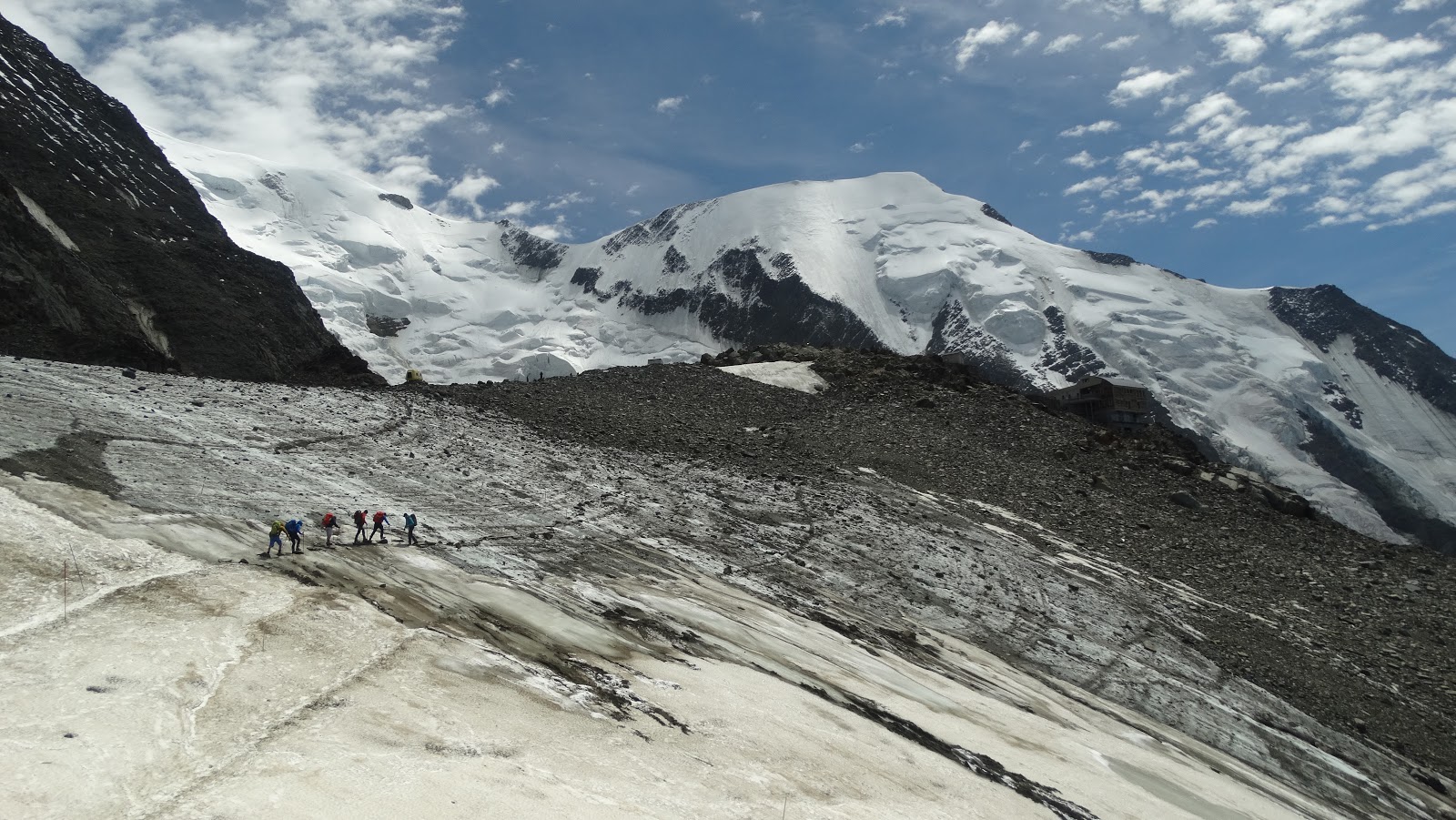 Una vez en el collado que da acceso a la cabaña de Rognes a 2.768 metros, y después de trepar por toda la pared, un refugio no guardado pero actualmente abierto, nos recibe para mostrarnos el nuevo camino por recorrer. Me sorprende el paisaje, donde la vegetación es inexistente, un aspecto desolador me rodea, por algo llaman a este lugar el Desert de Pierre-Ronde (Desierto de Piedra Redonda). A mi izquierda está el glaciar de Griaz, a mi derecha la bajada hacia Nid d'Aigle y justo de frente la subida al refugio y glaciar Tete Rousse, unos 400 metros de desnivel positivo.
