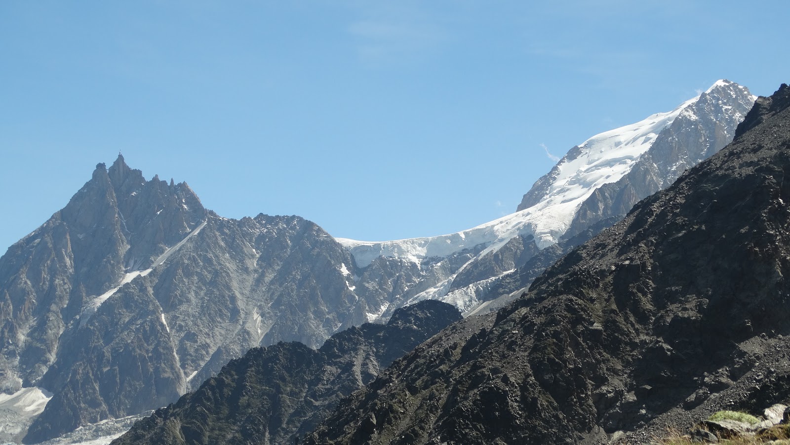 Las vistas a l'Aiguille du Midi desde este punto son magnificas, este pico con una altitud de 3.842 metros, es la más alta de las Agujas de Chamonix. La aguja es el punto de llegada del teleférico de l'Aiguille du Midi. Su estación superior está situada a 3.777 metros de altitud, aunque para alcanzar la punta a 3.842, existe un ascensor. El 4 de agosto de 1.818 fue alcanzada la cumbre norte por A. Malczewski, J.M. Balmat y otros cinco guías. Posteriormente, el 5 de agosto de 1856, J. A. Devouassoux y A. y J. Simond llegaron a la cumbre sur. También es visible la cima del Mont Blanc du Tacul de 4.248 metros, este montaña pertenece a otra gran vía de acceso al Mont Blanc como es la ruta de los cuatro miles, digna de ser intentada.