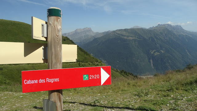 Continuando por las vías del tren, alcancé una zona plana, llamada Col du Mont Lachat a 2.025 metros, es el lugar elegido para cruzarse los trenes cremalleras, donde se detienen y el acompañante del maquinista acciona manualmente una palanca que hace mover los raíles al tramo paralelo. Justo aquí encontramos unos nuevos paneles indicativos, en ese punto descubrí que hay un sendero que sube directamente hasta este lugar sin tener que andar en paralelo a las vías del tren. Ahora una nueva marca en rojo, señala la dirección a seguir, este color indica que es una ruta de alta montaña y requiere prestar más atención y preparación física.