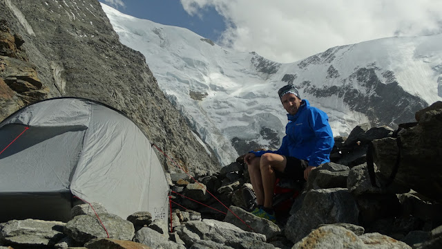 Cerca del lugar donde se montan las tiendas de campaña, hay una zona delimitada por cintas naranjas, este lugar está prohibida para caminar o acampar, es una zona frecuentada de caídas de rocas, pues toda la parte superior se encuentra muy descompuesta. El glaciar de Tete Rousse se atraviesa por la parte inferior, prestar bastante atención al pasar, lo normal es no tener los crampones puesto y cruzarlos sin ellos, yo como iba en zapatillas y llevaba unos específicos, me los puse y no tuve ningún problema. Para facilitar las cosas, hay algunos tablones de madera para cruzar los cauces de agua formados en el glaciar, en la zona de acampada se encuentra unos aseos, aunque no se encontraban en buen estado de limpieza, de todas formas se pueden usar los propios del refugio. En el centro de toda la planicie, se encuentra una caseta portátil de color amarilla reservada para los agentes del parque, cuando tienen que moverla hacen uso de un helicóptero. La tarde se pasa muy rápido, montar la tienda, asegurarla muy bien, pues el viento no cesa y es posible que aumente por la noche, ir a por agua al glaciar, hervirla y preparar la comida.