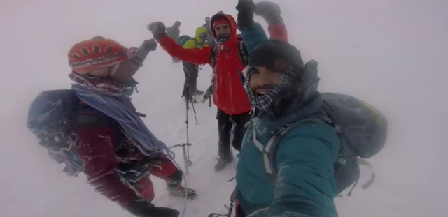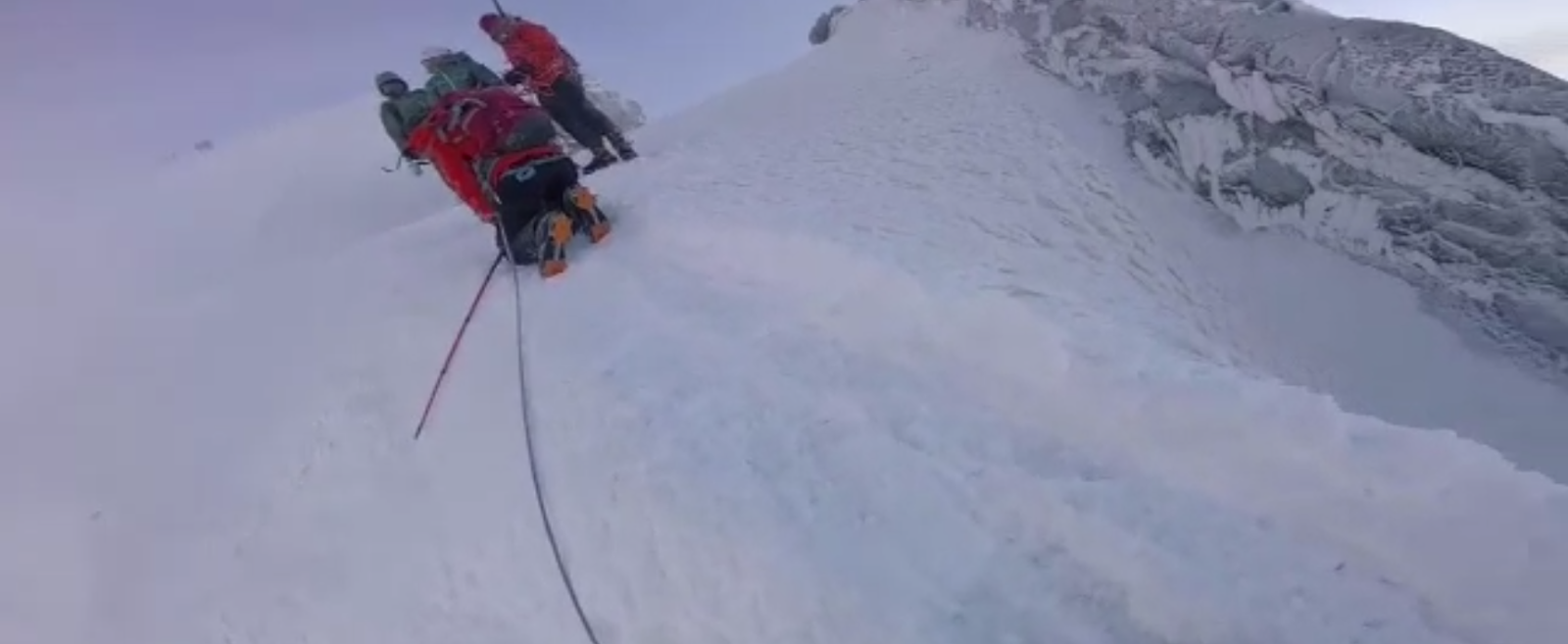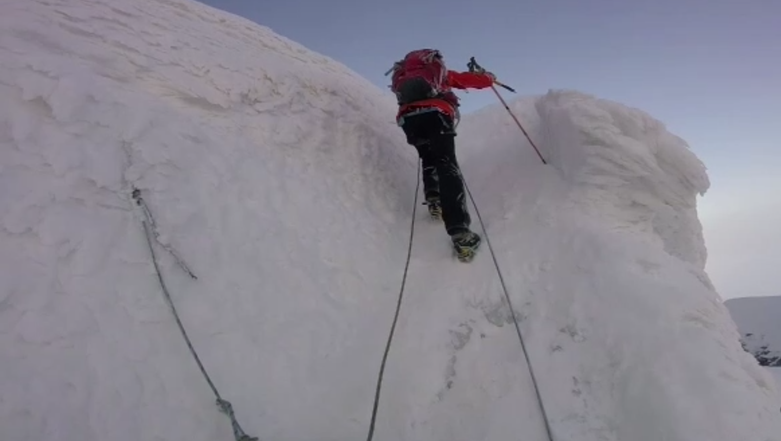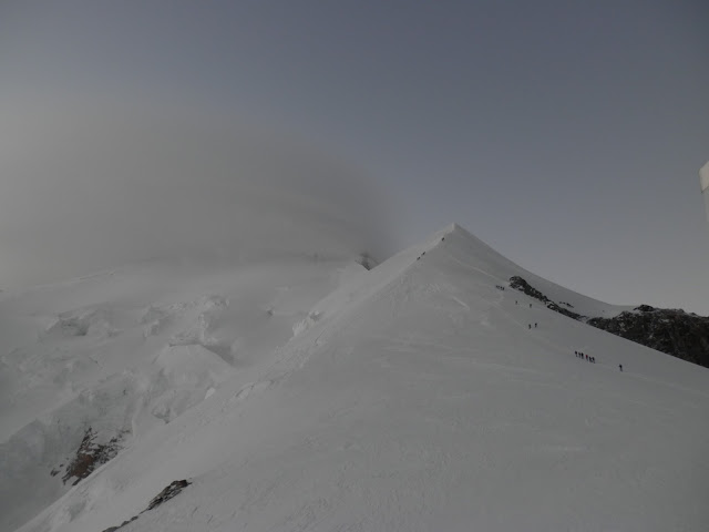 La cima roma del Mont Banc me recuerda al lomo de una ballena blanca, el momento lo recuerdo un poco agridulce, no pude disfrutar de la cima plenamente, sin vistas y con mucho frío. En cabeza, cuando el camino ya no ascendía más, llegué hasta donde se encontraba una cordada eufórica, eran Españoles y habían subido por la ruta de los cuatro miles, al preguntarle si estábamos en la cima, la respuesta era afirmativa, he incluso nos dijeron que si continuamos por la loma enlazaríamos por la ruta que ellos habían realizado. Unas pocas fotos para el recuerdo, abrazos y saltos, empezaba a encontrarme algo mal, así que sin más entretenimiento descendí sin prisas pero sin pausa. En el descenso a veces te cruzas con cordadas que suben, ellos tienen preferencias y con mucho tacto hay que apartarse a un lado de la arista, en mi caso clavaba con fuera el piolet y los crampones a un costado de la arista. Me parece fundamental estar acostumbrado a moverse por aristas y terrenos con importante exposición, para evitar que nos impresione y quedarnos bloqueados en algún momento comprometido.