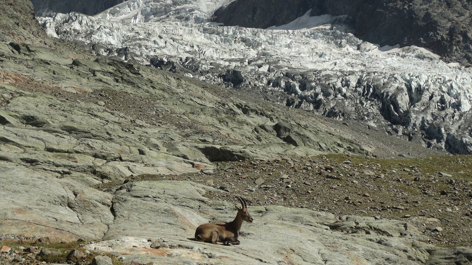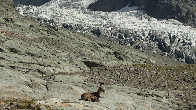 Al llegar al refugio de Vallot, mi compañero Jordan ya no se encontraba, mi parada fue mínima y continué con el descenso por si podía alcanzarlo. Una bajada rápida, recuerdo adelantar a otras cordadas que bajaban relajadas, satisfechas de lo vivido, en mi caso hasta que no me encontré descendiendo por las grandes palas del Dome du Goûter no me relajé, dejé de tener frío, ya que esta zona está mas protegida del viento, las nubes quedaron arriba, el cielo se mostró con un azul intenso y el sol apretaba que daba gusto. La nieve se había transformado, lo que por la mañana era una pista de patinaje, se había convertido en un pastizal. Cuando me encontraba por encima del nuevo refugio de Goûter, por su arista, tuve la suficiente lucidez para detenerme y sentarme en la nieve durante un buen rato, no era consciente de lo que me estaba perdiendo, por querer bajar rápido y descansar en la tienda de montaña estaba sacrificando unas vistas espectaculares, el glaciar de Taconnaz se expandía a mis pies con su caos de seracs, al fondo el glaciar de Bossons y la Aiguille du Midi. Una vez en el refugio viejo de Goûter, me quito los crampones, guardo el piolet, me quito un poco de ropa y empiezo el descenso por la arista disfrutando de las vistas al valle sabiendo que un poquito del Mont Blanc se quedaría en mí. A mitad de la arista me encontré a Jordan bastante perjudicado, de esta forma terminamos juntos en el lugar donde habíamos empezado trece horas antes.