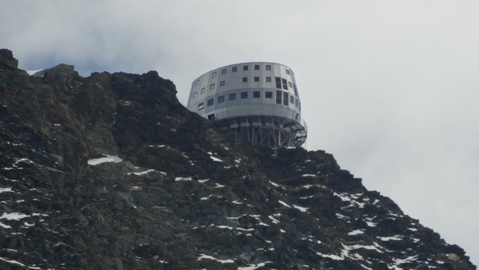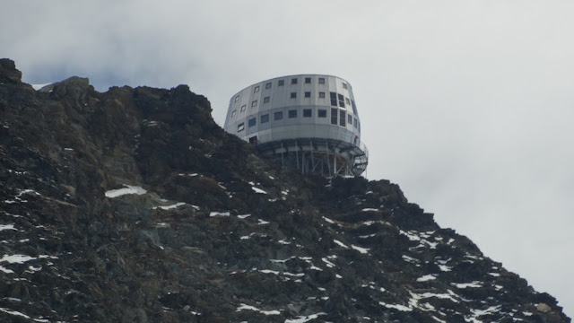 En el antiguo refugio de Goûter nos volvimos a juntar, protegidos por un costado del propio refugio, había sido una trepada muy divertida y sin contratiempos, ahora la climatología había cambiado severamente, el viento era muy fuerte y la niebla no dejaba ver más allá de una decena de metros. Desde aquí hay unos 200 metros hasta el nuevo refugio, unos pocos metros empinados y llegamos a la arista de nieve que enlaza con nuestro destino. Nos pusimos los crampones, la nieve estaba muy dura y en la cresta hasta el nuevo refugio el viento golpeaba muy fuerte, no se veía nada, cabeza agachada y siguiendo una línea marcada con maroma llegamos al nuevo refugio casi al trote en dos horas desde la tienda de campaña. Entramos en el nuevo refugio de Goûter, la puerta está abierta, yo me senté en un banco que se encuentra en la pequeña entrada que precede a la sala destinada a equiparse, durante media hora permanecí sentado, inquieto, convenciéndome de que lo correcto era esperar a que la gente bajara desde la planta superior y fueran otros los que tomaran la decisión de salir en primera posición.