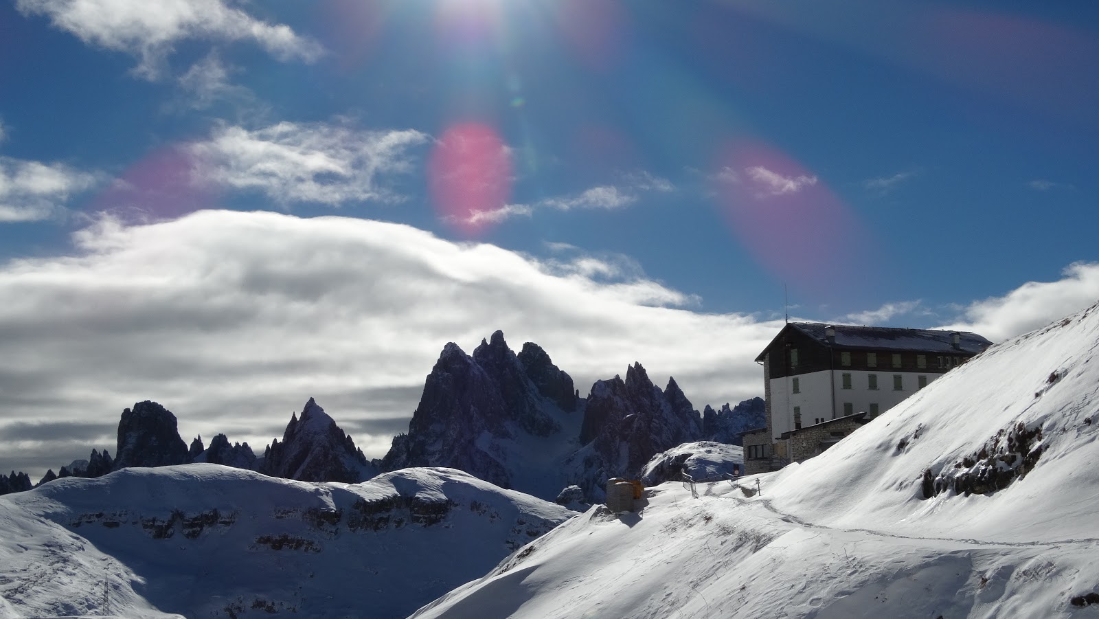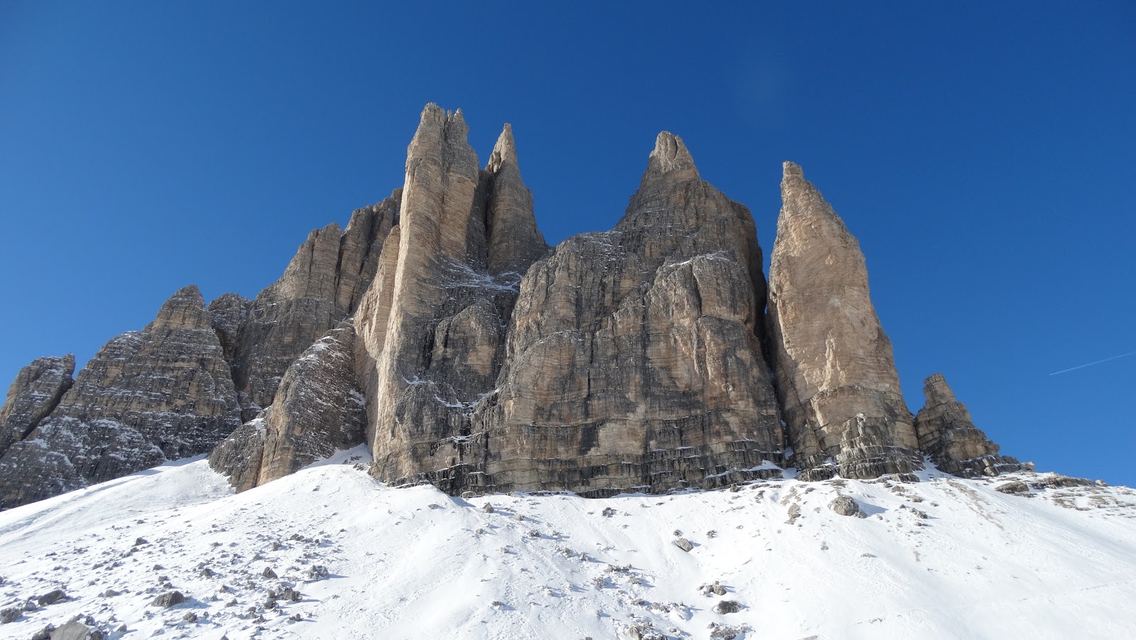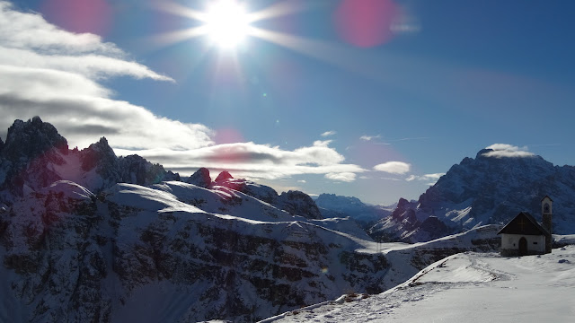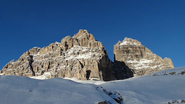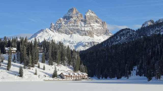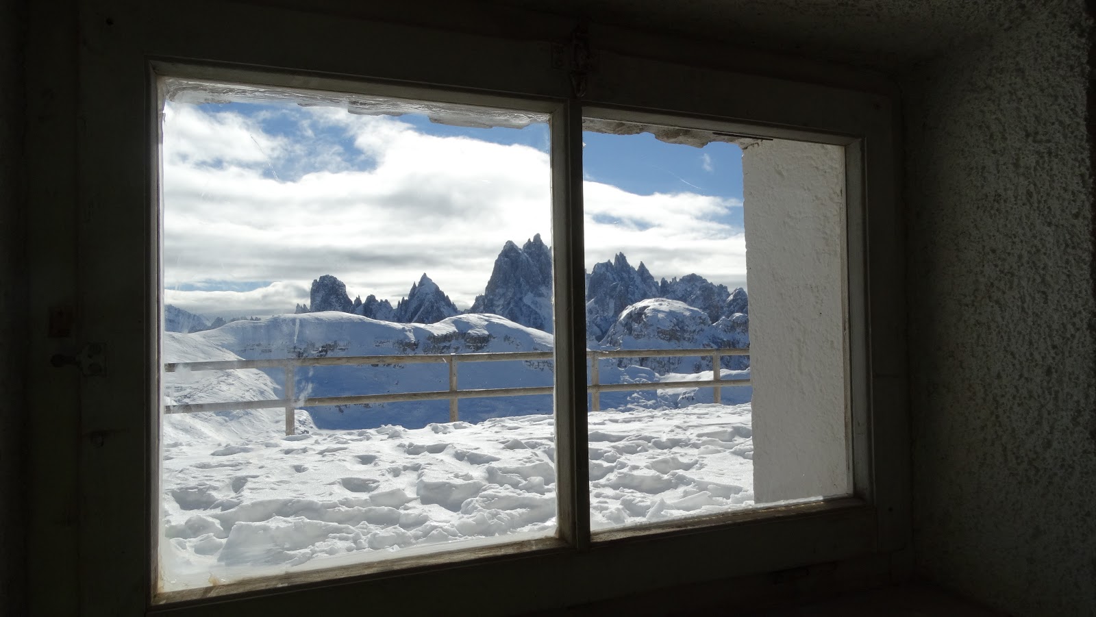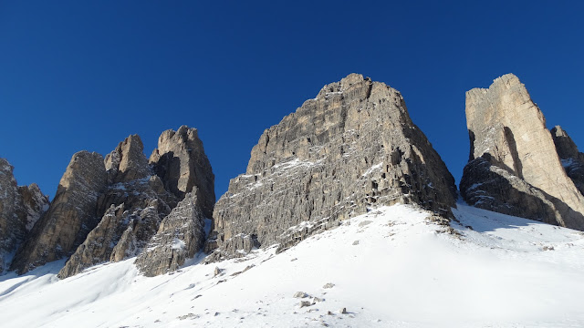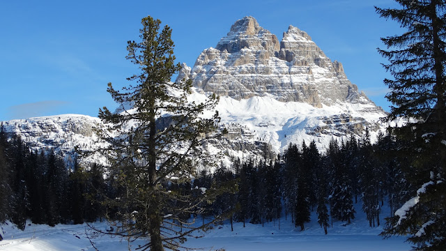 Pasar unos días recorriendo las Tres Cimas de Lavaredo era uno de mis principales objetivos en los Dolomitas. Las Tres Cimas de Lavaredo dan nombre al Parque Natural de Tre Cime, muy cerca de la frontera de Italia con Austria, y de hecho, limitaban ambos países hasta inicios del siglo XX. A consecuencia de las grandes nevadas, el coche tuve que dejarlo a orillas del congelado Lago Antorno, a un kilómetro del Lago Misurina, el mayor lago natural de Cadore, a 1.754 metros sobre el nivel del mar. Célebre por su particular clima que mitiga las afecciones respiratorias, por lo que próximo al lago se encuentra el único centro en Italia para el tratamiento del asma infantil. Desde el coche hasta el Refugio Auronzo fueron seis kilómetros sobre un profundo manto de nieve polvo, sin raquetas ni esquís, el calentón fue considerable. Las vistas desde el cerrado Refugio Auronzo son impresionantes, el esfuerzo para llegar hasta allí ya merece la pena y más aun con el aspecto del paisaje dejado por la nieve. A unos 2 Kilómetros del refugio Auronzo se halla el refugio Lavaredo en dirección contraria a las agujas del reloj, el camino hasta aquí empeoró, la pista dejó paso al sendero alpino, sin huella en la nieve y los días tan cortos, completar la ruta se hacia una misión imposible. Las Tres Cimas de Lavaredo, o "Tre Cime di Lavaredo" en italiano, son visibles en todo momento durante el recorrido, la forman tres singulares picos que parecen evocar las almenas de un gigantesco castillo. Estas tres cimas son, probablemente, la agrupación de picos más conocida de las Dolomitas y uno de los lugares más fotografiados de la cadena montañosa. Los tres picos se denominan, de este a oeste, Cima Piccola, Cima Grande y Cima Ovest. La Cima Grande se eleva a una altura de 2.999 metros, alzándose 142 metros sobre la más pequeña, la Cima Piccola. Al final no se pudo realizar el circuito completo y tuvimos que dar la vuelta sobre los pasos recorridos, pero el haber estado en aquel lugar en aquel momento, fue un recuerdo inolvidable.