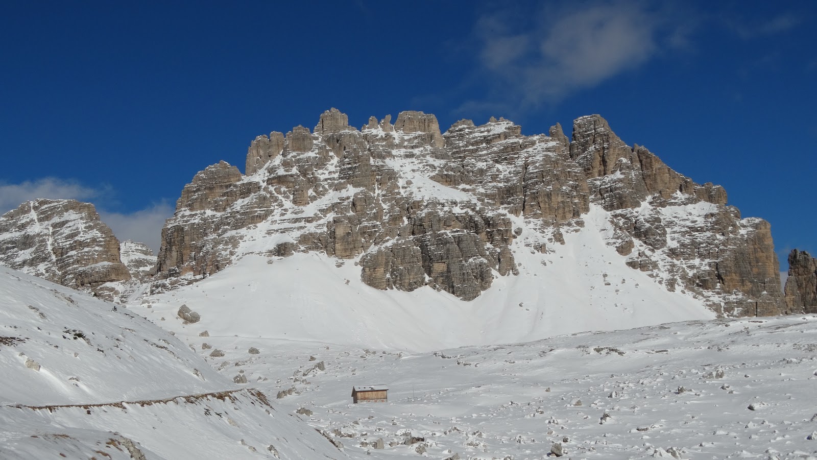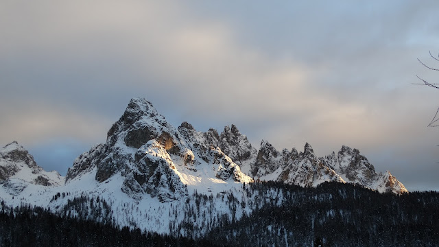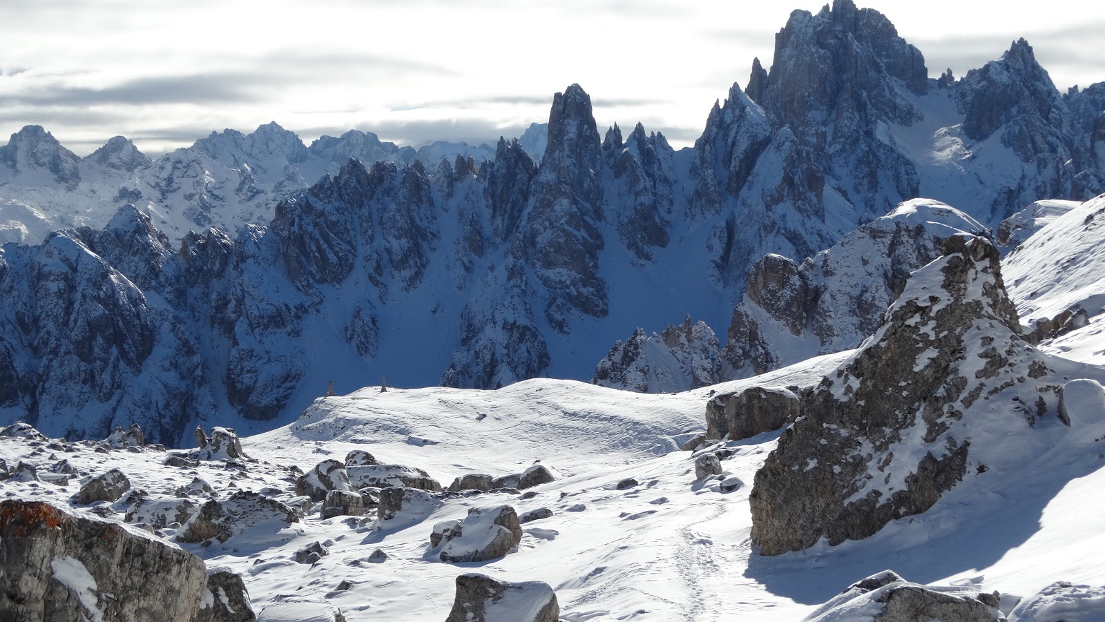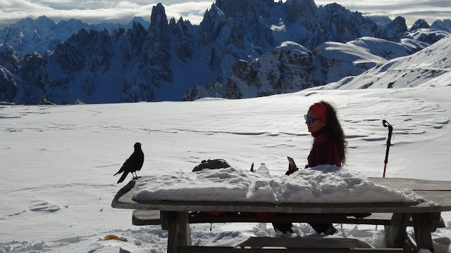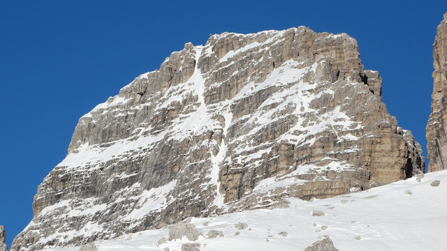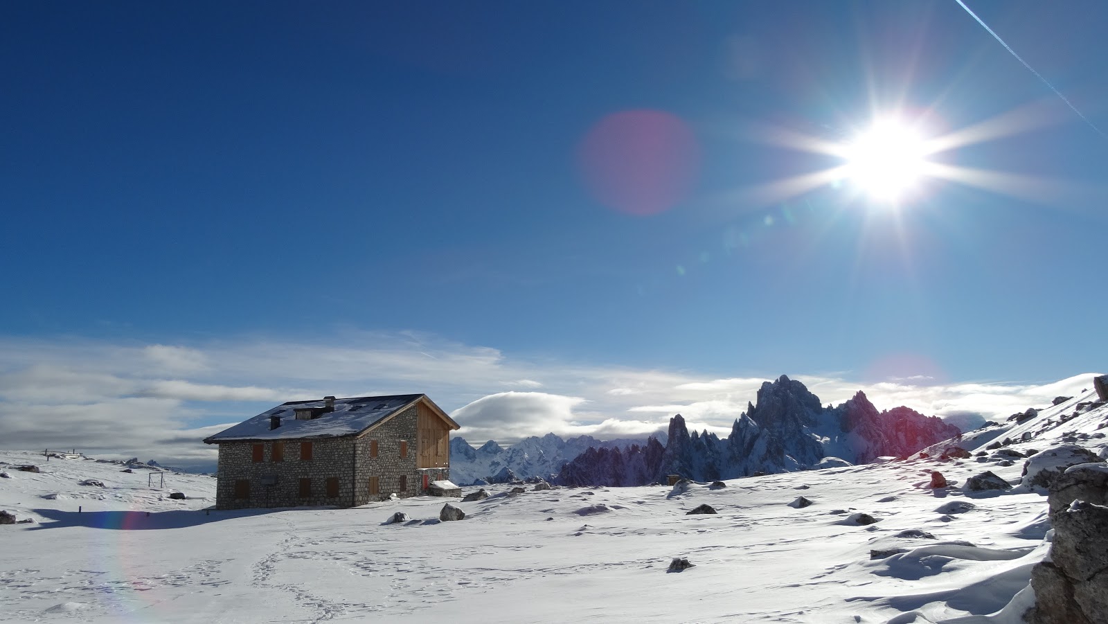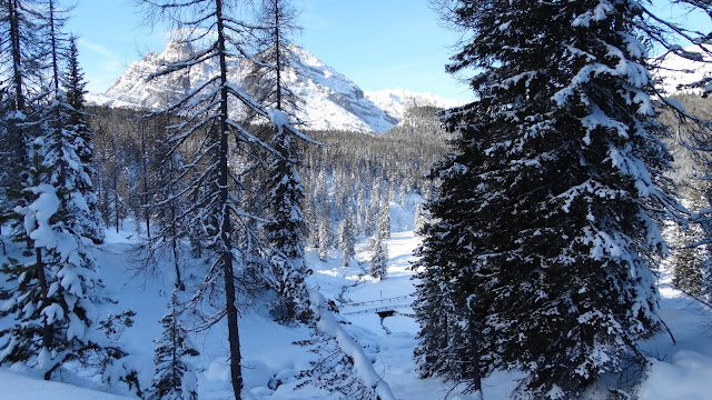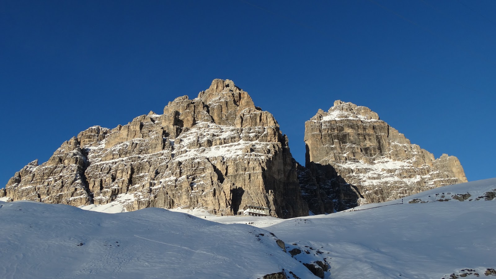 Pasar unos días recorriendo las Tres Cimas de Lavaredo era uno de mis principales objetivos en los Dolomitas. Las Tres Cimas de Lavaredo dan nombre al Parque Natural de Tre Cime, muy cerca de la frontera de Italia con Austria, y de hecho, limitaban ambos países hasta inicios del siglo XX. A consecuencia de las grandes nevadas, el coche tuve que dejarlo a orillas del congelado Lago Antorno, a un kilómetro del Lago Misurina, el mayor lago natural de Cadore, a 1.754 metros sobre el nivel del mar. Célebre por su particular clima que mitiga las afecciones respiratorias, por lo que próximo al lago se encuentra el único centro en Italia para el tratamiento del asma infantil. Desde el coche hasta el Refugio Auronzo fueron seis kilómetros sobre un profundo manto de nieve polvo, sin raquetas ni esquís, el calentón fue considerable. Las vistas desde el cerrado Refugio Auronzo son impresionantes, el esfuerzo para llegar hasta allí ya merece la pena y más aun con el aspecto del paisaje dejado por la nieve. A unos 2 Kilómetros del refugio Auronzo se halla el refugio Lavaredo en dirección contraria a las agujas del reloj, el camino hasta aquí empeoró, la pista dejó paso al sendero alpino, sin huella en la nieve y los días tan cortos, completar la ruta se hacia una misión imposible. Las Tres Cimas de Lavaredo, o "Tre Cime di Lavaredo" en italiano, son visibles en todo momento durante el recorrido, la forman tres singulares picos que parecen evocar las almenas de un gigantesco castillo. Estas tres cimas son, probablemente, la agrupación de picos más conocida de las Dolomitas y uno de los lugares más fotografiados de la cadena montañosa. Los tres picos se denominan, de este a oeste, Cima Piccola, Cima Grande y Cima Ovest. La Cima Grande se eleva a una altura de 2.999 metros, alzándose 142 metros sobre la más pequeña, la Cima Piccola. Al final no se pudo realizar el circuito completo y tuvimos que dar la vuelta sobre los pasos recorridos, pero el haber estado en aquel lugar en aquel momento, fue un recuerdo inolvidable.