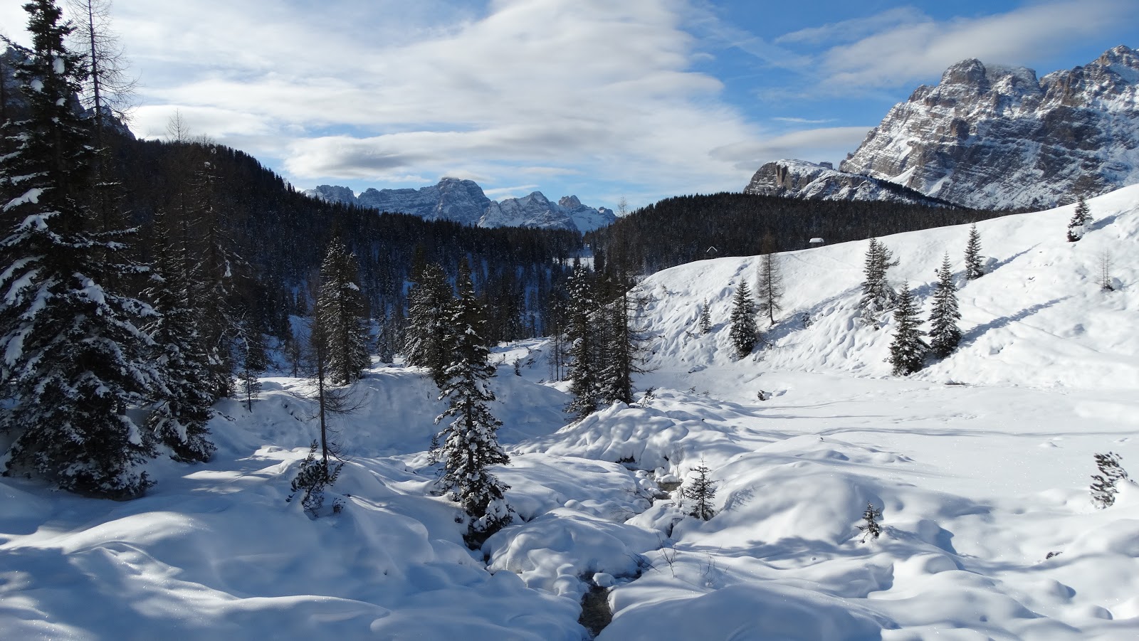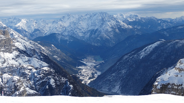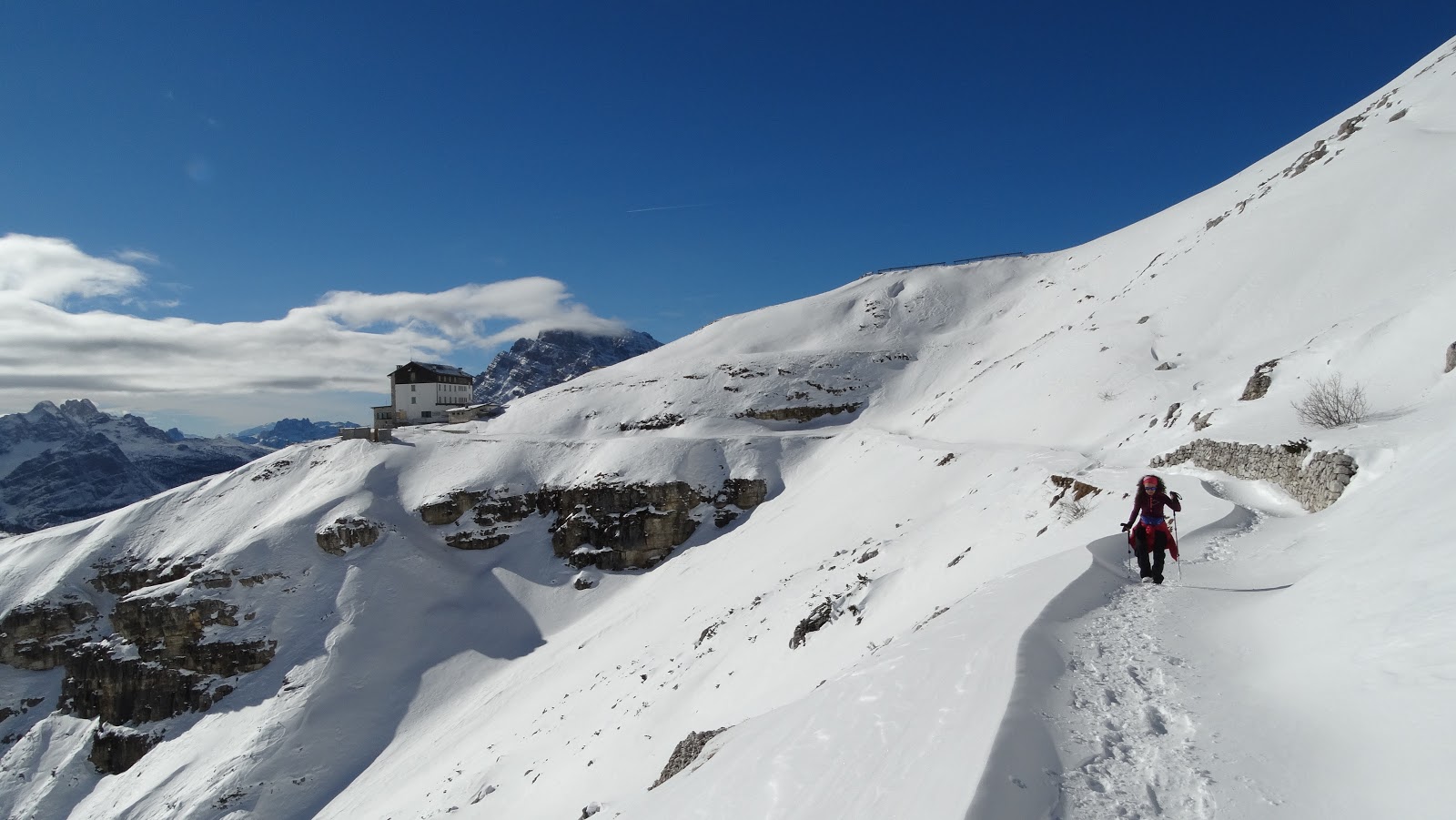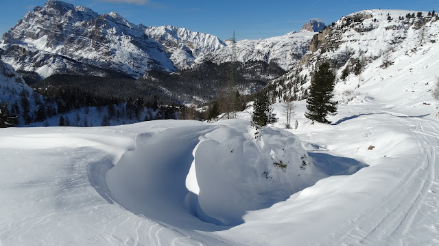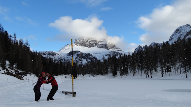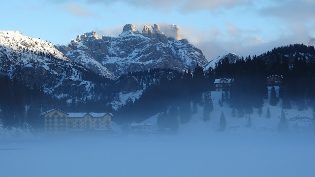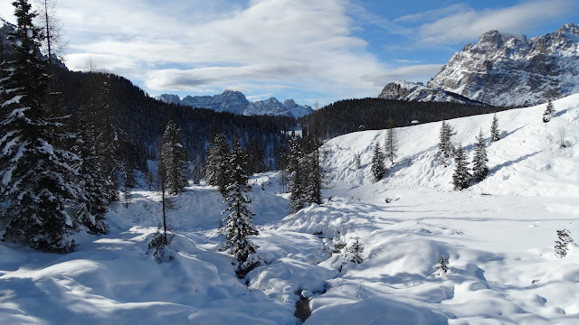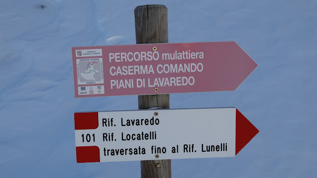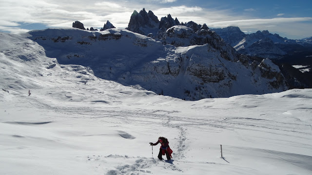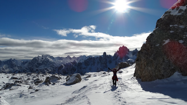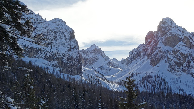 Pasar unos días recorriendo las Tres Cimas de Lavaredo era uno de mis principales objetivos en los Dolomitas. Las Tres Cimas de Lavaredo dan nombre al Parque Natural de Tre Cime, muy cerca de la frontera de Italia con Austria, y de hecho, limitaban ambos países hasta inicios del siglo XX. A consecuencia de las grandes nevadas, el coche tuve que dejarlo a orillas del congelado Lago Antorno, a un kilómetro del Lago Misurina, el mayor lago natural de Cadore, a 1.754 metros sobre el nivel del mar. Célebre por su particular clima que mitiga las afecciones respiratorias, por lo que próximo al lago se encuentra el único centro en Italia para el tratamiento del asma infantil. Desde el coche hasta el Refugio Auronzo fueron seis kilómetros sobre un profundo manto de nieve polvo, sin raquetas ni esquís, el calentón fue considerable. Las vistas desde el cerrado Refugio Auronzo son impresionantes, el esfuerzo para llegar hasta allí ya merece la pena y más aun con el aspecto del paisaje dejado por la nieve. A unos 2 Kilómetros del refugio Auronzo se halla el refugio Lavaredo en dirección contraria a las agujas del reloj, el camino hasta aquí empeoró, la pista dejó paso al sendero alpino, sin huella en la nieve y los días tan cortos, completar la ruta se hacia una misión imposible. Las Tres Cimas de Lavaredo, o "Tre Cime di Lavaredo" en italiano, son visibles en todo momento durante el recorrido, la forman tres singulares picos que parecen evocar las almenas de un gigantesco castillo. Estas tres cimas son, probablemente, la agrupación de picos más conocida de las Dolomitas y uno de los lugares más fotografiados de la cadena montañosa. Los tres picos se denominan, de este a oeste, Cima Piccola, Cima Grande y Cima Ovest. La Cima Grande se eleva a una altura de 2.999 metros, alzándose 142 metros sobre la más pequeña, la Cima Piccola. Al final no se pudo realizar el circuito completo y tuvimos que dar la vuelta sobre los pasos recorridos, pero el haber estado en aquel lugar en aquel momento, fue un recuerdo inolvidable.