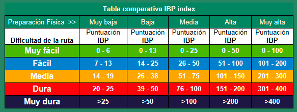una actividad analizada consultando una tabla en la que se compara nuestro estado de forma con la puntuación obtenida. Es posible darle una utilidad inversa a la tabla, es decir, además de situar la dificultad de una ruta respecto a la preparación física de cada uno, también nos sirve para conocer y comparar nuestra progresión física en función de los resultados IBP que vamos obteniendo. Por ejemplo; si tú le preguntas a alguien ¿Qué IBP tiene para ti una ruta “Muy dura”? la respuesta que te dé, te dará una idea de la diferencia de forma física que hay entre ambos. La siguiente tabla está sacada de https://www.ibpindex.com/index.php/es/ la página referente al indice IBP y desde donde se puede analizar nuestras rutas.