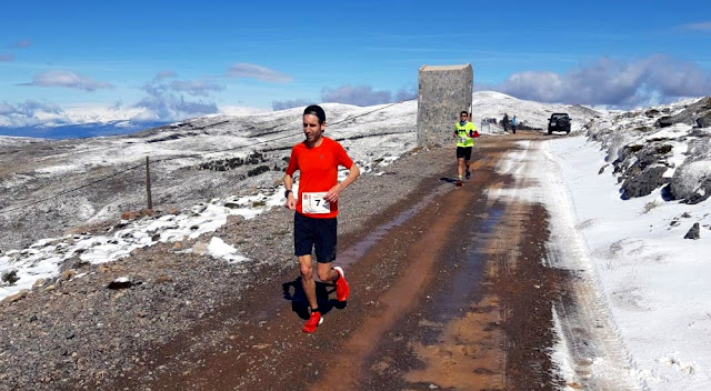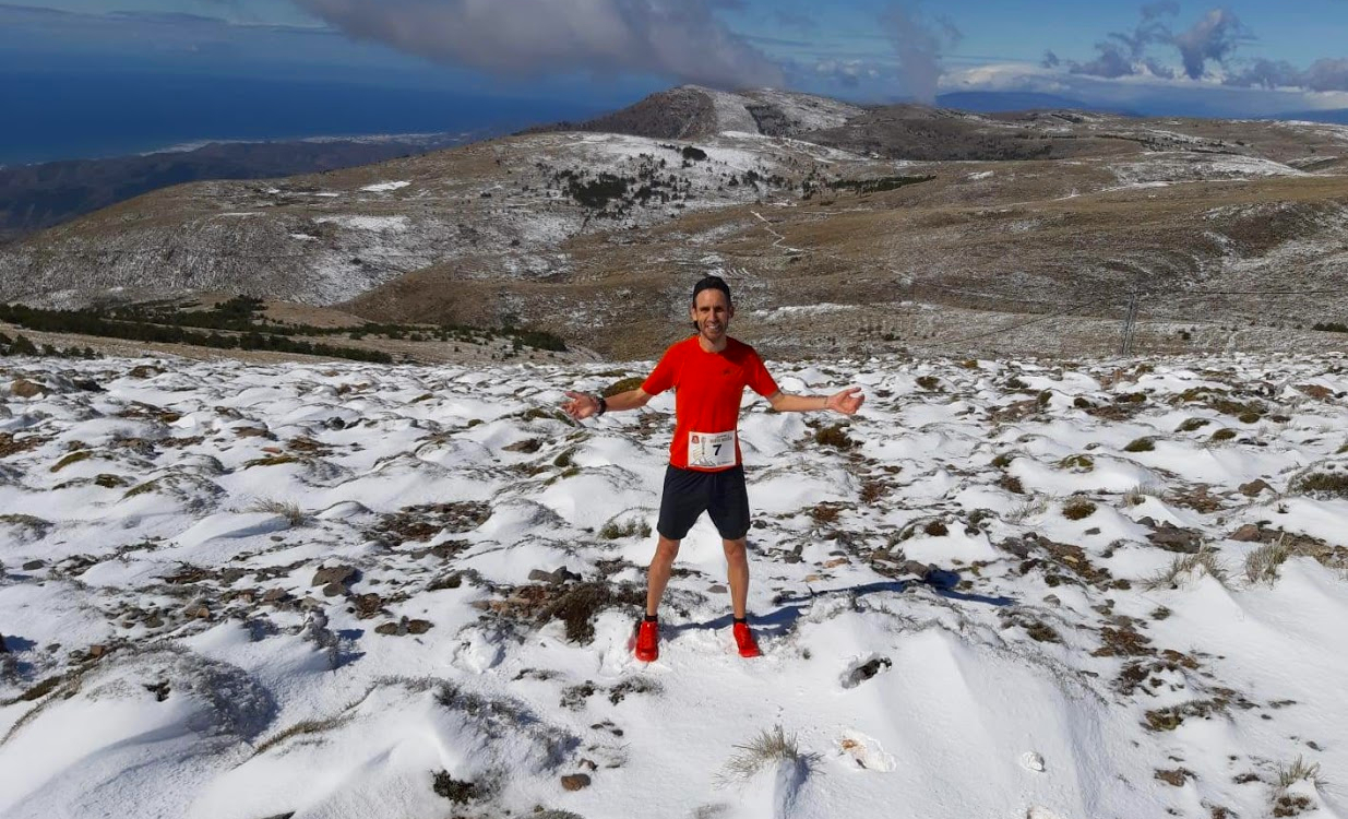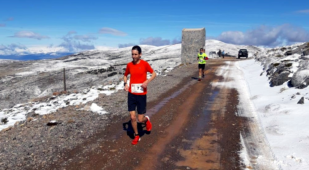 Hay una pista que da varias revueltas, pero la carrera siempre discurre por senderos, algunos técnicos y otros más fáciles. A veces da un poco de tregua la subida, pero hay que ser consciente de que a menudo se afrontan fuertes repechos y si no reservas un poco te deja clavado. En Fuente Alta a 1.750 metros, hay un avituallamiento, junto a un refugio de montaña y un nacimiento de agua. La vista desde aquí es espectacular con los pinares de la Sierra de Gador por los que hemos ascendido, las extensiones de invernaderos del poniente almeriense y, al fondo, el mar Mediterráneo. Pasados los 2.000 metros de altitud el paisaje cambiaba bruscamente pasando a