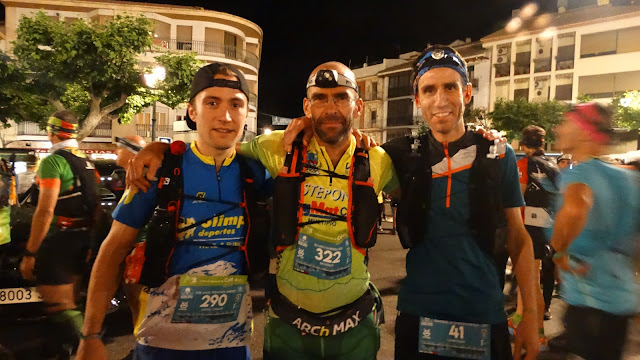 Después del calvario que pasé hace 20 días para terminar la Ultra Magina Top Trail, venia con un poco de incertidumbre sobre mi rendimiento, primero porque no sabía bien si había recuperado físicamente del esfuerzo anterior o me pasaría factura con el paso de los kilómetros y segundo, quería controlar mejor el tema de la alimentación en carrera, no quería mas sustos en pleno esfuerzo. En la línea de salida, un gran ambiente auguraba un buen espectáculo, la música animaba y corredores como José Angel Fernández o Víctor Pimentel darán más valor si cabe a estos impresionantes senderos cuando escriban sus nombre con el esfuerzo que supone cada zancada dada al devorar los kilómetros. La implicación emocional de José Angel en esta carrera era máxima, autóctono de esta sierra, llevaba varias semanas hablando de la carrera, tiene el sentido de la historia, de cada piedra, rincón o grieta del recorrido y eso repercute sobre el rendimiento final. Una salida neutralizada por un pueblo repleto de gente, colorido y con fuego a su paso por la plaza de Santa María daba inicio a una fuerte subida hacia el Puerto del Gilillo de 9 kilómetros. En poco más de una hora pasé por el puerto, donde había un avituallamiento, no paré, me había tomado un gel a los 45 minutos de tomar la salida y llevaba bastante agua. Atrás quedó el iluminado pueblo de Cazorla, ya no se veía, nos dirigíamos al siguiente avituallamiento, el Collado de bajada a Gualay, donde me detuve a rellenar los bidones y coger un plátano. Siempre rodando entre los 15 primeros, a veces, cuando levantaba la cabeza, a lo lejos se veían las luces de los primeros y si miraba hacia atrás, una hilera de frontales seguían una misma dirección.