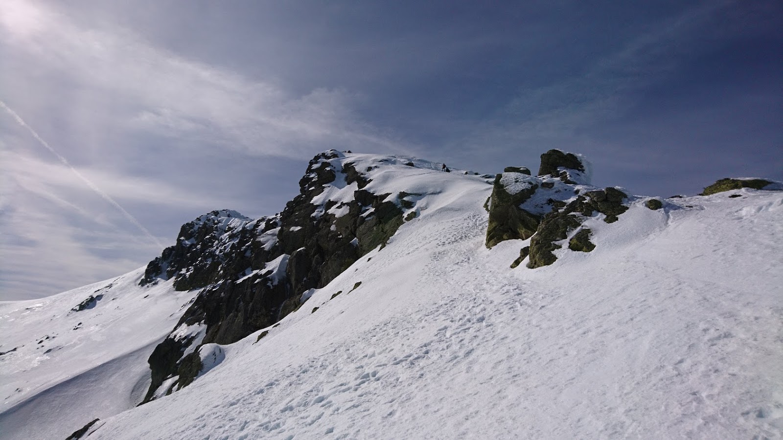 Los días anteriores había caído una gran cantidad de nieve, era mi primera vez por aquellos terrenos, y el entorno era increíble. Había agua en abundancia, crucé un río varias veces, siempre a la sombra, hasta llegar a una zona donde los arboles desaparecen, alrededor de 2.000 metros de altitud. Pasado el puerto de los Neveros, todo era más evidente, la dirección a tomar. Destacar la subida al Risco de los Pájaros de 2.266 metros de altitud. El inicio consta con una subida suave hasta llegar a la zona mas rocosa. Desde aquí tenemos una fuerte pendiente que rápidamente acabará en la cima del propio Risco. Pasado este primero llegamos al famoso Risco de los Claveles de 2.387 metros de altitud. Lugar que cuenta en su haber con el triste récord de tener el mayor número de accidentes de la Sierra de Guadarrama, según me comento un esquiador de travesía con el que compartí un rato de la subida. Yo lo encontré bastante peligroso, porque la roca se encontraba cubierta de hielo, pero incluso, si pretendía evitar la cresta, el paso a media ladera, por mi derecha, era más peligroso si cabe con una caída semejante a la del lado izquierdo. Pasado este punto, comencé a ver la cumbre del Peñalara, era bastante reconocible por la gente que se encontraba y se dirigía a ella. Es el pico mas alto de la Sierra de Guadarrama con 2.429 metros.