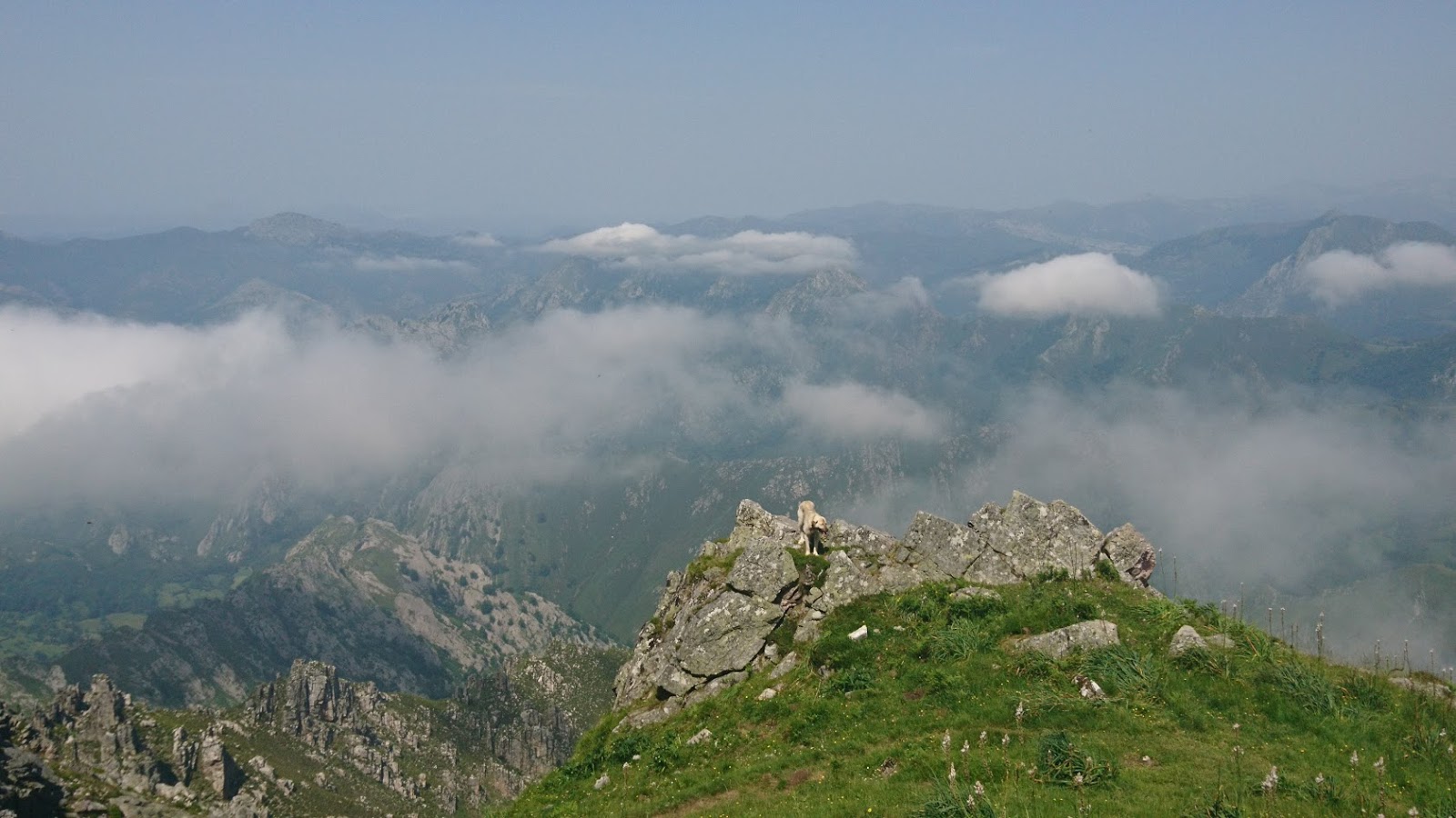 Nuevamente, nos adentramos en otra canal tallada en el espolón de Los Palomos y tapizada de hayas. Alcanzamos el collado de Los Palomos, lugar desde donde se contemplan los parajes que hemos recorrido y perspectivas mucho más amplias que las obtenidas hasta ahora en esta subida. Hemos pasado a la vertiente occidental de Peña Mea, y ahora hemos de dirigirnos ladeando a media altura hacia la majada de La Boyica a 1.325 metros, remoto lugar y herbosa campera donde se emplaza una cabaña casi colgada en el aire. Dos perros pastores habitan en ella y guardan el rebaño de ovejas para protegerlas de los lobos. En la Boyica giraremos hacia el este para por sendero muy marcado ascender por los canales de La Fuente para alzarnos más adelante en la arista final. Sin variar el rumbo, pronto aparece a la vista la airosa cima donde culmina la ascensión a Peña Mea. La cima está coronada con un vértice geodésico, una caseta, una placa solar y un buzón montañero. Las vistas son admirables, incluso se puede observar el Macizo de Ubiña a lo lejos.